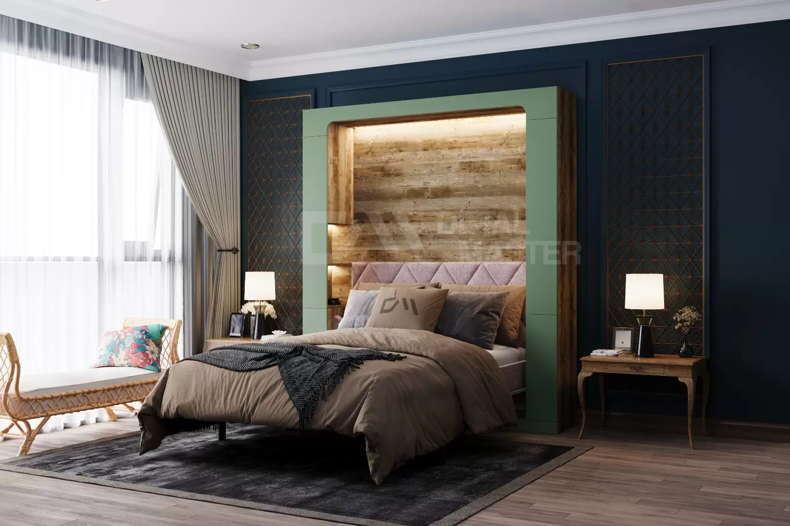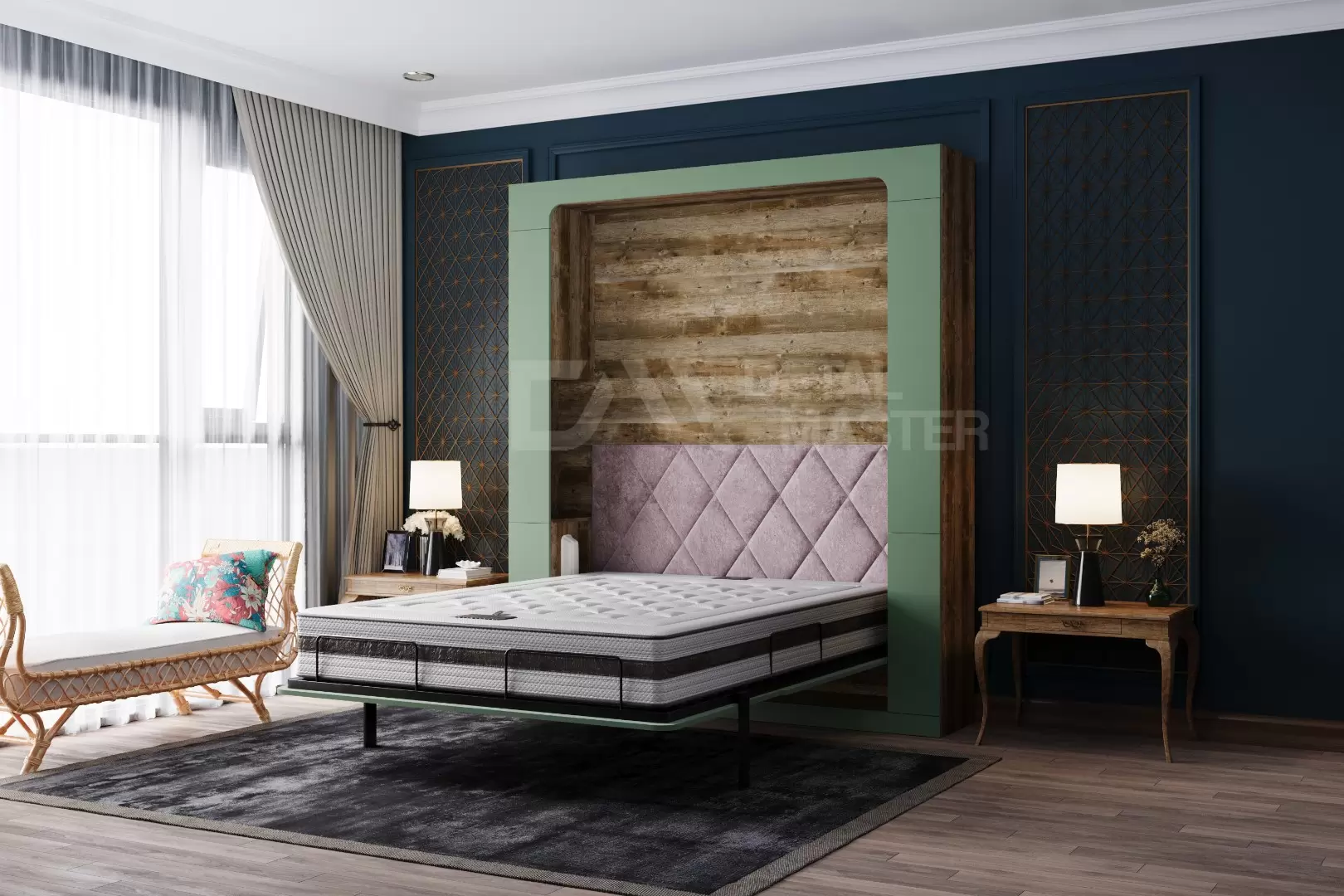 Фасад шкаф-кровати выполнен из МДФ супер матовый Фисташка, со сглаженными краями. Что позволит обезопасить вас от ударов при ходьбе возле кровати в разложенном положении и добавит изысканность модели шкаф-кровати. Корпус выполнен из ЛДСП декор Кейптаун. По бокам модель оснащена полками для хранения вещей с закрывающимися дверцами.
